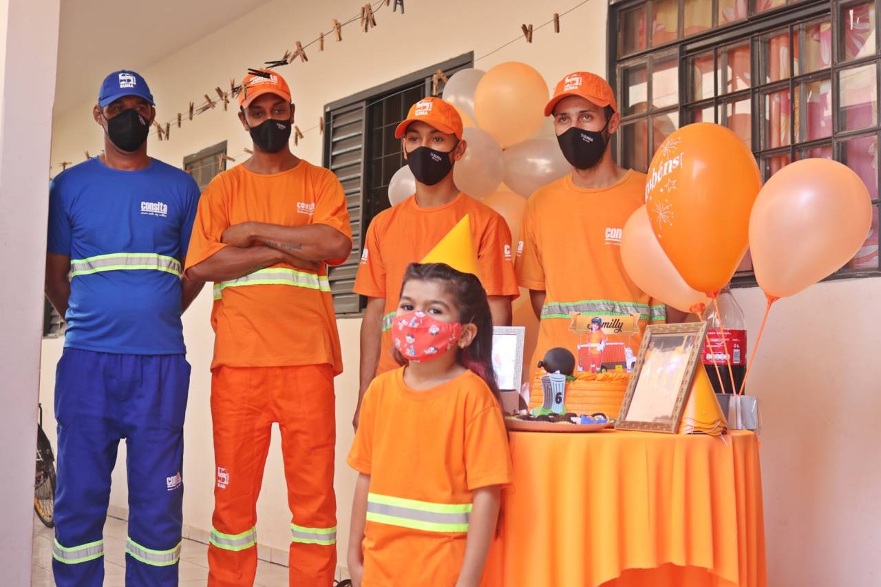 Nas fotos, Maria Samilly aparece sorridente ao lado do bolo com uma decoração que lembra o trabalho dos profissionais responsáveis pela limpeza da cidade. O alaranjado, cor do uniforme dos garis, foi predominante na festa e estava presente no bolo, nos balões e até na roupa de Samilly. A garota ainda aproveitou para receber o carinho dos convidados.