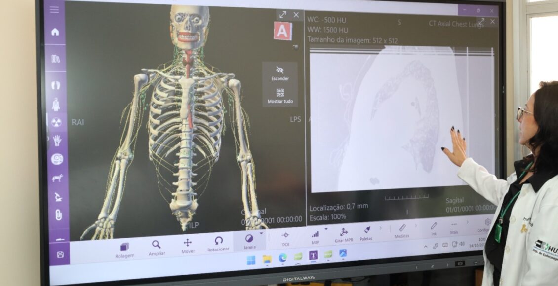 O laboratório conta com simuladores realísticos e duas mesas digitais de anatomia inéditas em Maringá. As mesas permitem explorar órgãos, tecidos e sistemas do corpo humano, oferecendo experiência de realidade virtual e recursos de imagens médicas detalhadas.