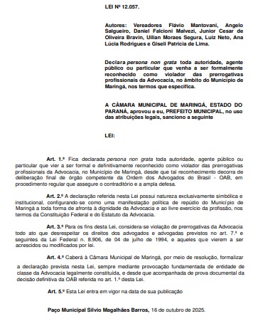 A advocacia maringaense conquistou mais um importante instrumento em defesa das prerrogativas profissionais. Foi sancionada nesta quinta-feira (16) pelo prefeito Silvio Barros e publicada no Diário Oficial do Município a Lei nº 12.057 , aprovada pela Câmara Municipal de Maringá, que declara persona non grata toda autoridade, agente público ou particular que for formalmente reconhecido pela Ordem dos Advogados do Brasil (OAB) como violador das prerrogativas da advocacia.