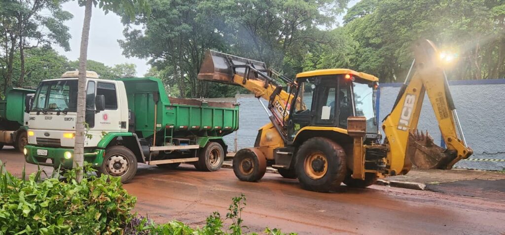 As equipes municipais e a Defesa Civil também atuam em ocorrências na Rua Pioneiro João Custódio Pereira e na Avenida Presidente Juscelino Kubitschek de Oliveira, onde há registros de danos provocados pelo vento forte.