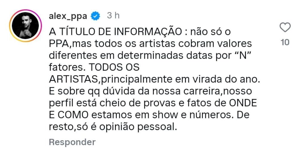 A reportagem procurou o escritório que representa a dupla Pedro Paulo & Alex, que não respondeu aos questionamentos até o fechamento desta publicação. No Instagram do Maringá Post, o cantor Alex Stella comentou sobre o assunto, justificando que a época do ano teria influência nos valores cobrados. Leia o comentário abaixo: