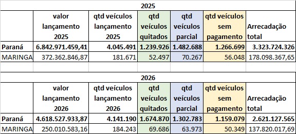 De acordo com os dados da Sefa, 52.497 veículos haviam quitado o imposto em Maringá até o dia 5 de março de 2025. Já em 2026, até 2 de março, o número subiu para 69.686 – ou seja, 32,7% a mais.