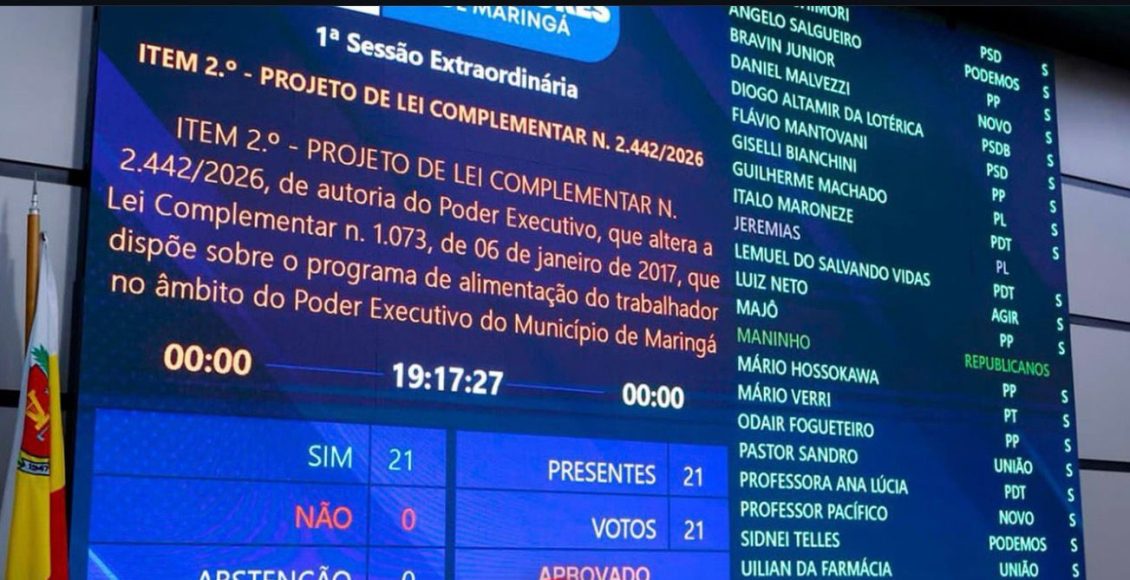 A Câmara Municipal de Maringá aprovou por unanimidade, em sessão extraordinária realizada na noite de terça-feira (17), os projetos de lei que regulamentam o reajuste salarial dos servidores públicos municipais. As propostas fazem parte da Campanha Salarial 2026, conduzida pelo Sindicato dos Servidores Públicos Municipais de Maringá (SISMMAR).