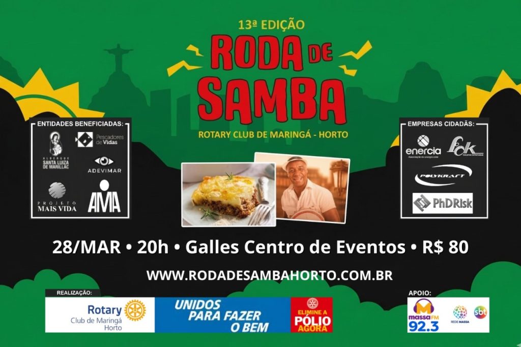 O Rotary Club de Maringá-Horto promove neste sábado (28) a 13ª edição da tradicional Roda de Samba solidária, evento que reúne música, gastronomia e arrecadação de recursos para entidades assistenciais da cidade. A programação começa às 20h, no Galles Centro de Eventos.