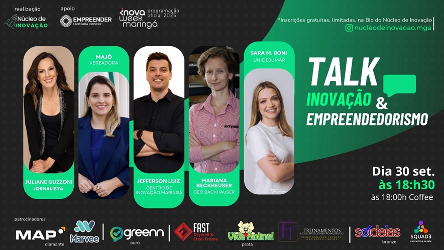 • Talk: Inovação e Empreendedorismo — mesa redonda mediada pela jornalista Juliane Guzzoni, com participação da vereadora Majô, da Mariana Beckheuser (eleita pela Forbes entre as 100 mulheres mais poderosas do agro em 2022), de Jefferson Luiz (Centro de Inovação de Maringá) e de Sara M. Boni (Unicesumar). O bate-papo trará reflexões sobre inovação, educação, empreendedorismo e desenvolvimento regional.