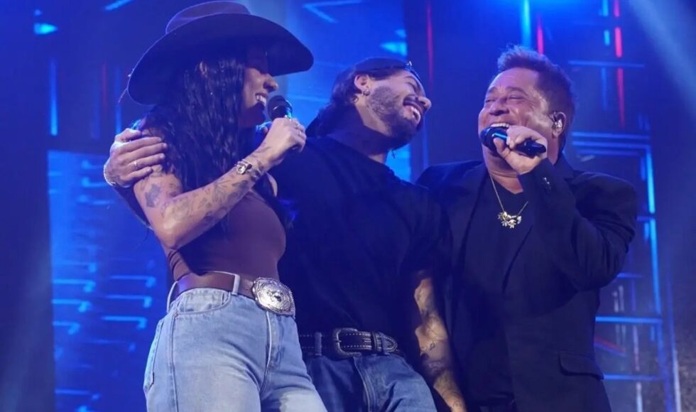 O show do cantor Leonardo na Exporandi 2025, realizado na sexta-feira (17), teve um momento de destaque com a participação surpresa de Ana Castela e Zé Felipe.