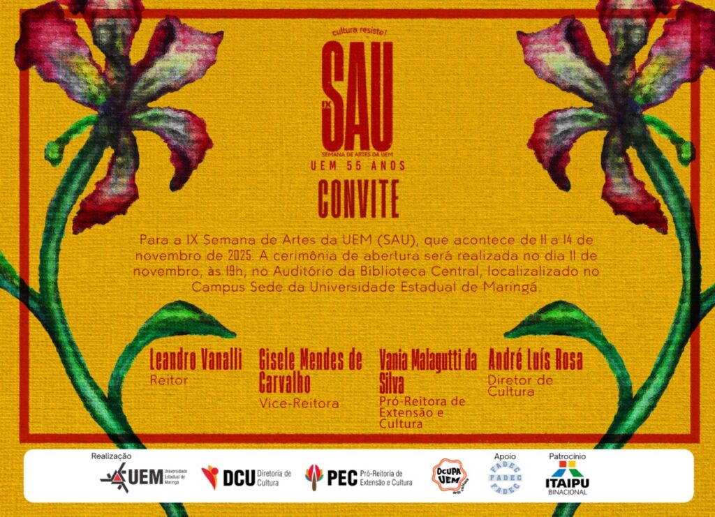 A Universidade Estadual de Maringá (UEM) realizará, entre os dias 11 e 14 de novembro de 2025, a IX Semana de Artes da UEM (SAU). Organizado pela Diretoria de Cultura (DCU) e pelo Comitê Gestor Cultural, o evento tem o objetivo de celebrar e fortalecer a produção artística dentro e fora do ambiente acadêmico.