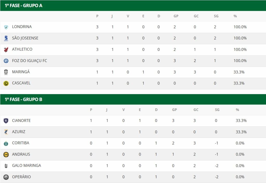 Londrina e São Joseense, pelo saldo de gols, são líderes do Grupo A, seguidos de Foz do Iguaçu e Athletico-PR, que também têm três pontos cada; o Cianorte, nos critérios de desempate, lidera o Grupo B seguido pelo Azuriz, cada um com um ponto.