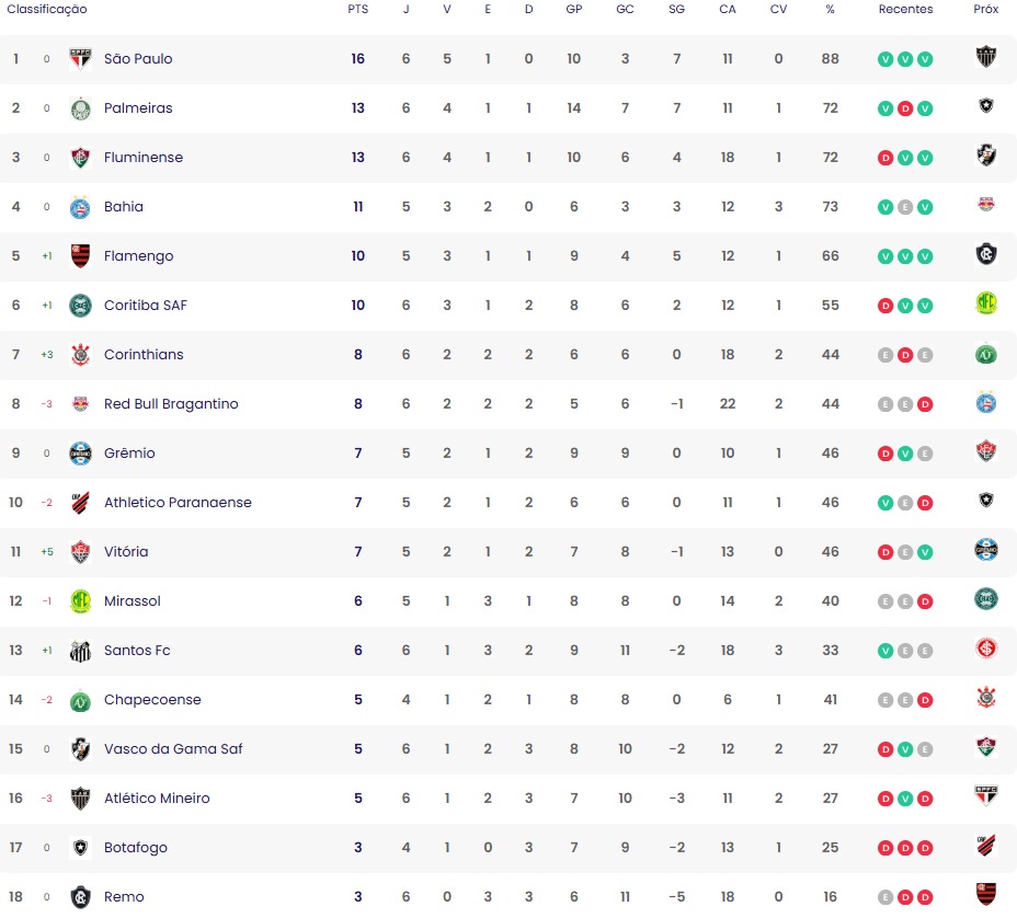 O Remo, que também subiu da Série B, ainda não se encontrou e permanece na zona de rebaixamento, em 18º lugar, com apenas três pontos.