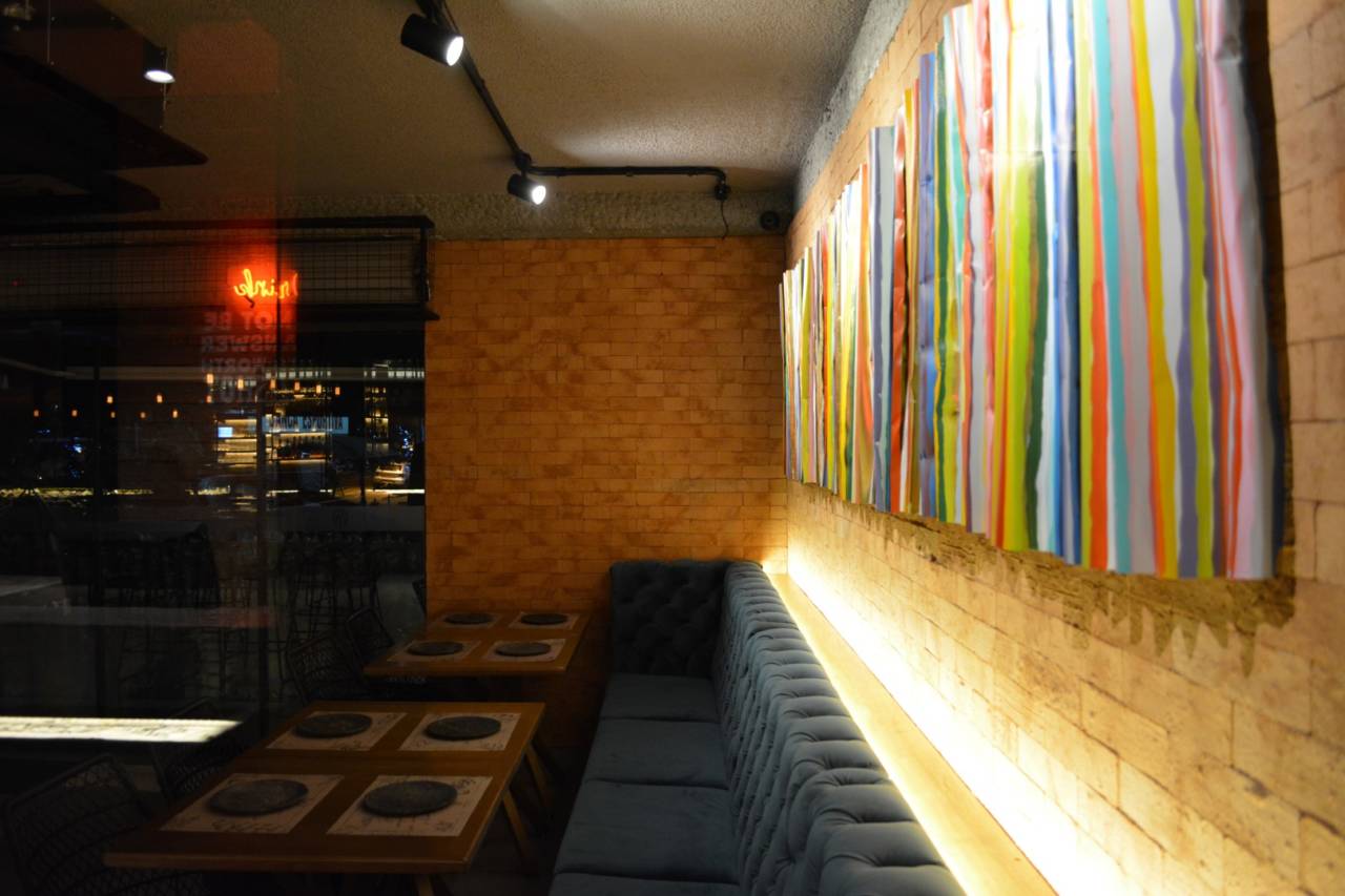 No seu interior, atrai os olhos um balcão em L no centro do salão, com banquetas que surpreendem pelo conforto e pela sensação de segurança de uma cadeira macia. Não dá para não notar um comprido quadro retangular multicolorido em metal retorcido, feito sob encomenda, pelo renomado artista plástico maringaense Paolo Ridolfi.
