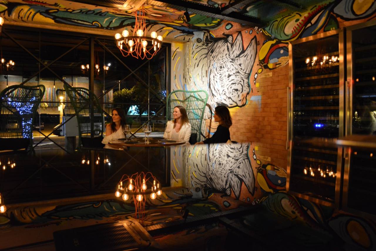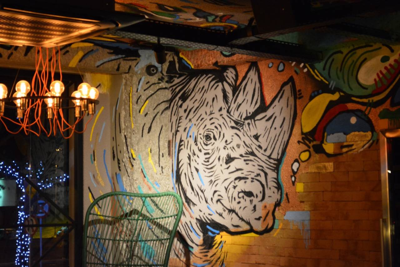 E, na parede ao lado, também atrai as pupilas a pintura de um rinoceronte, obra de Nuno Skor, de Maringá. O projeto arquitetônico é do escritório Na Escala Arquitetura e Interiores, das arquitetas Camila Farias, Juliana Carrasco Rodelli e Nádia Borlina.