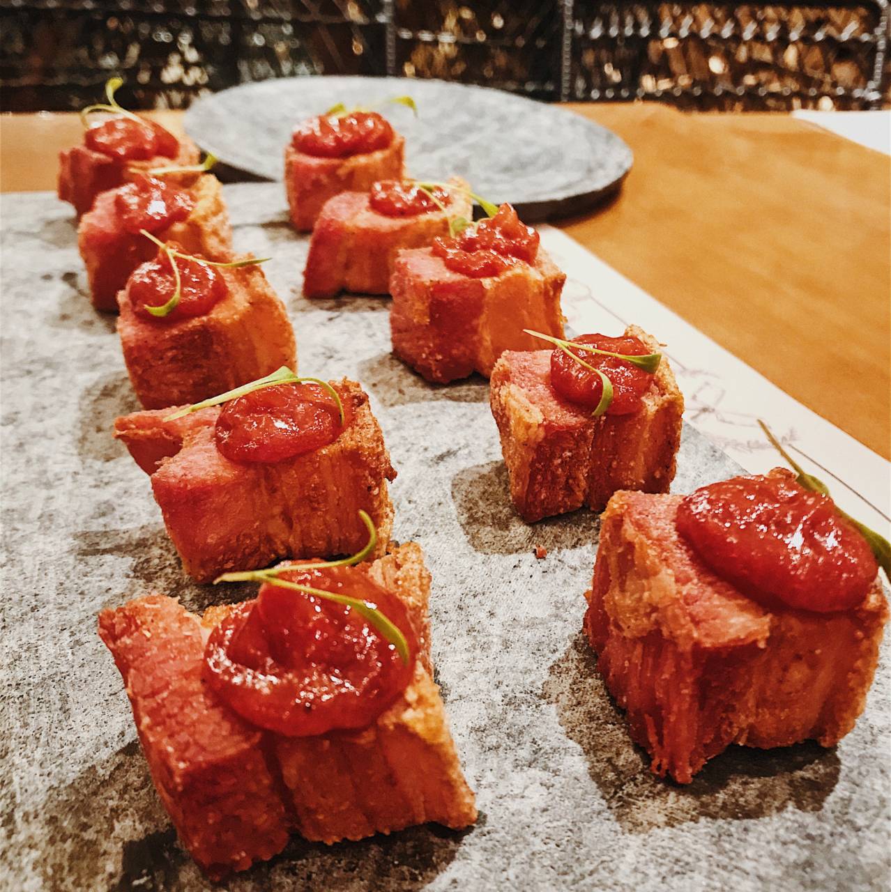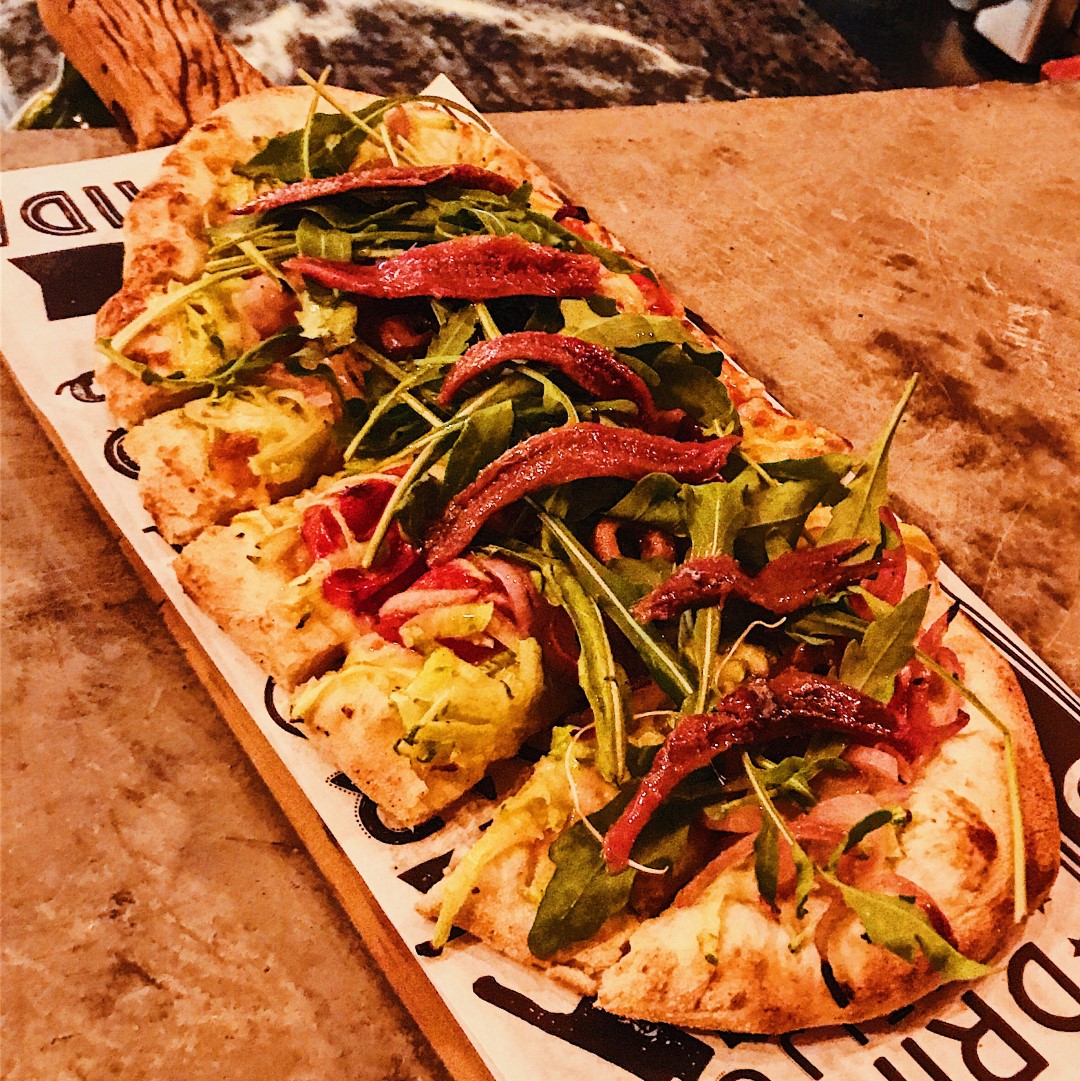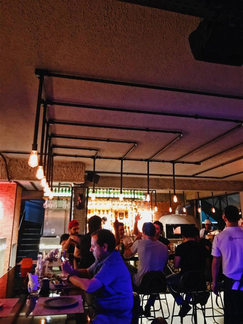 Beira à gula, mas o objetivo era conhecer. Também experimentamos uma focaccia de aliche, com massa preparada na fornearia do Mannaia, abobrinha ralada, cebola roxa, tomate e azeitona preta, prato elaborado pelo chef Leandro Carreira, sim, o mesmo do Habanero Grill. A entrada foi barriga de porco em dadinhos crocantes cuidadosamente dispostos em travessa de pedra sabão, vindas de Minas Gerais, cobertos com creme de goiabada caseira (R$ 22). E chopp Stella Artois gelado ao ponto.