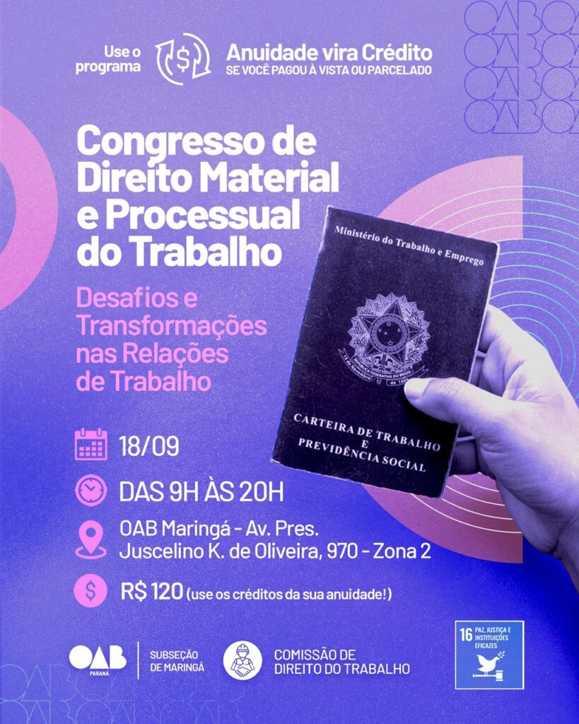 Com 11 horas/aula de duração, o congresso será realizado das 09h às 20h, na sede da OAB Maringá (Av. Juscelino Kubitschek de Oliveira, nº 970). O investimento é de R$ 120,00 e as vagas são destinadas a advogados, estudantes e profissionais interessados em atualização e aprofundamento no Direito do Trabalho.