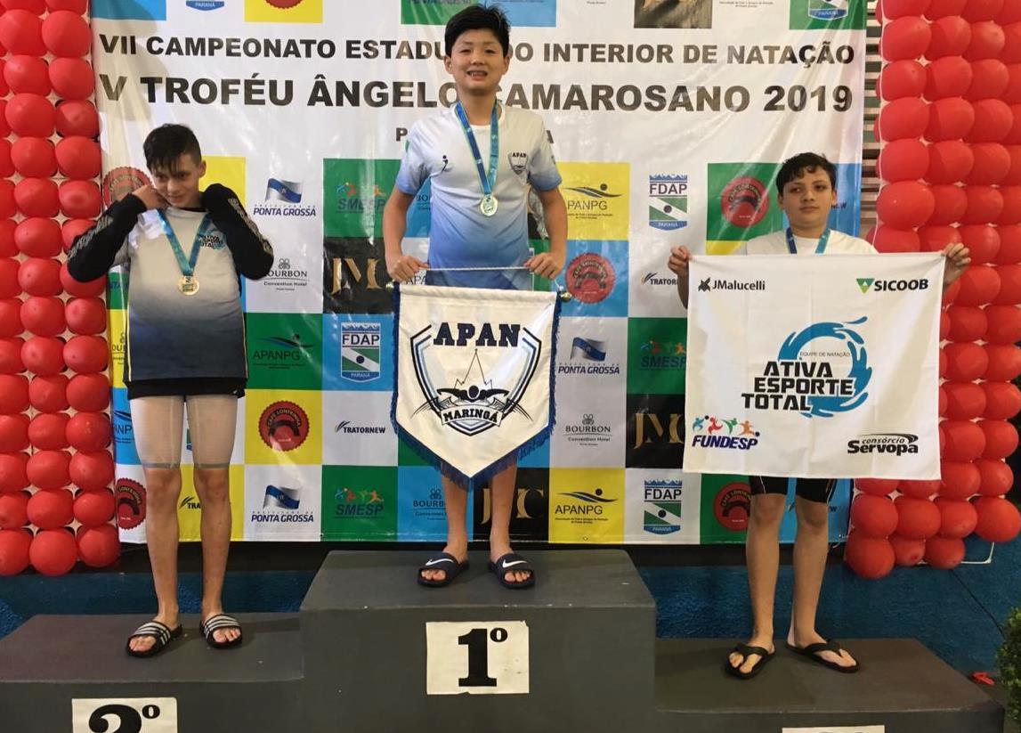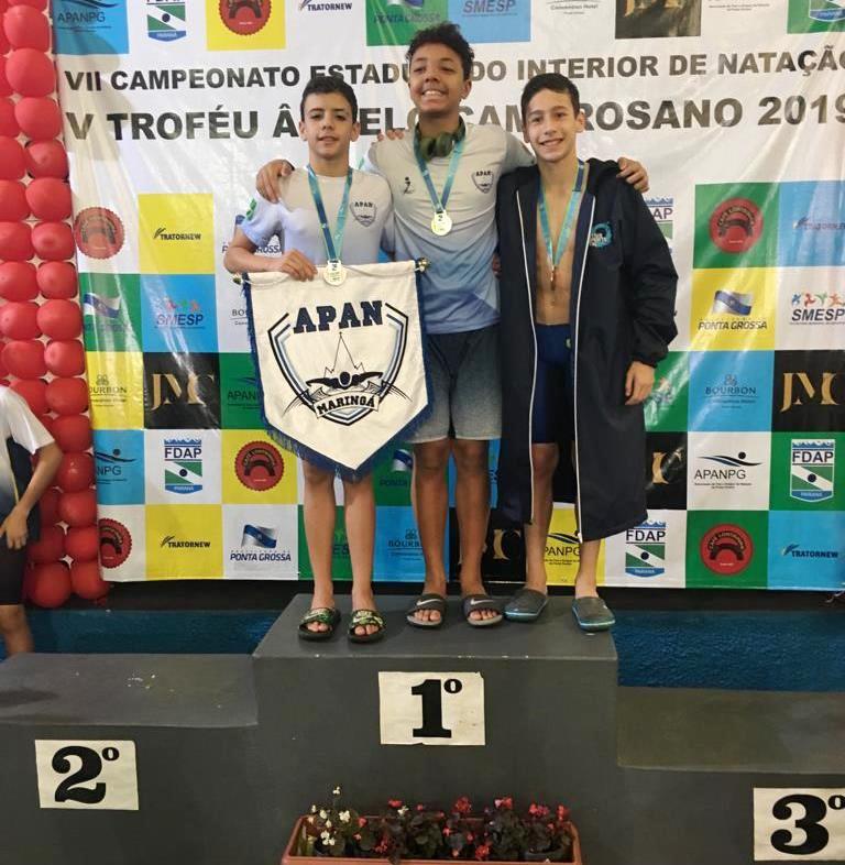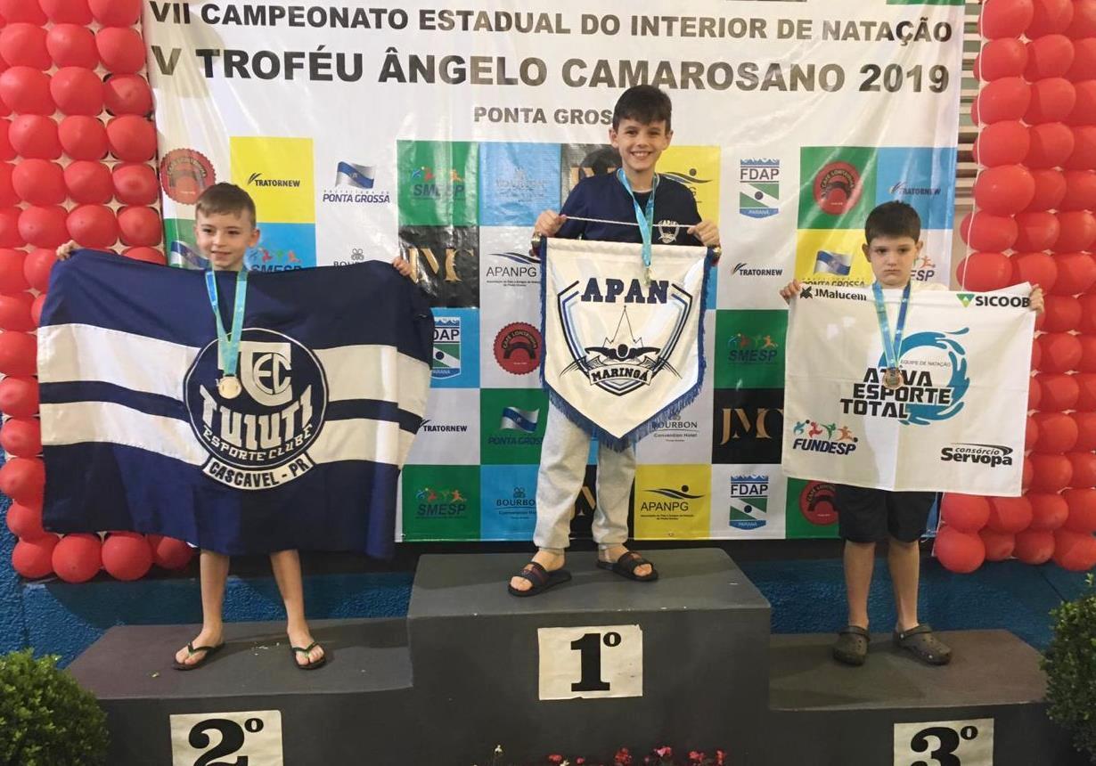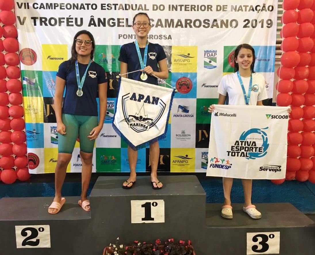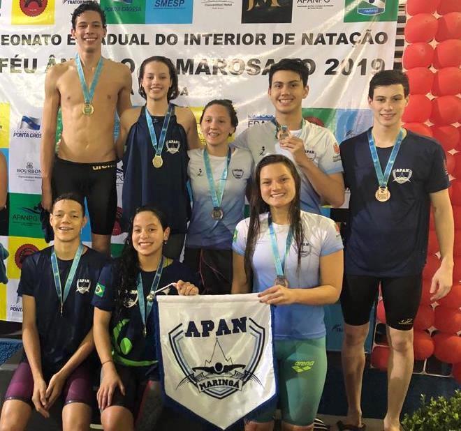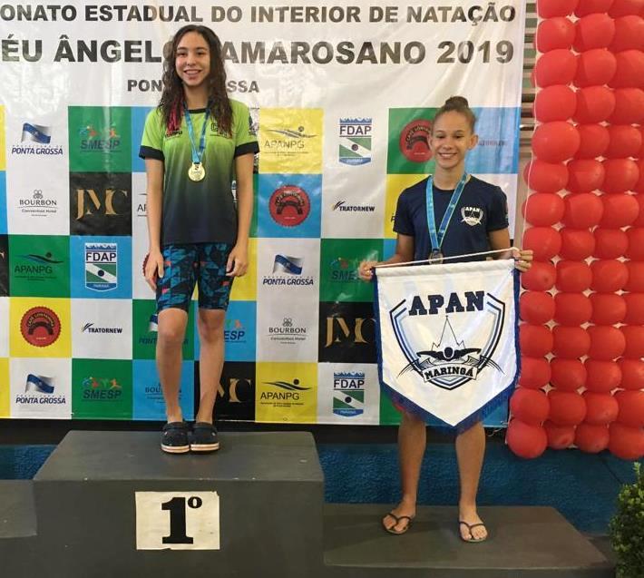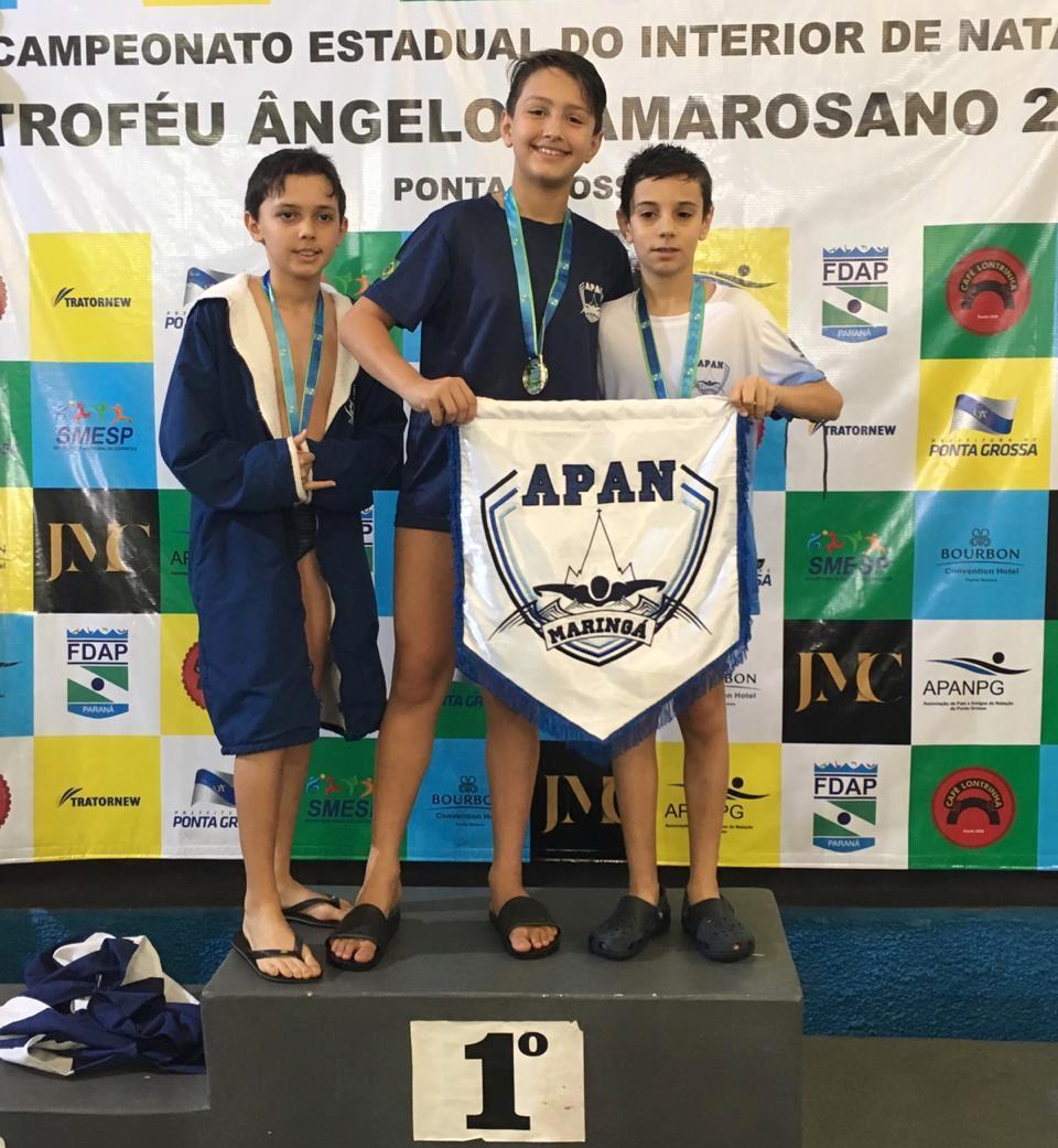 A Associação de Pais e Atletas da Natação (APAN) de Maringá – melhor equipe do interior do Paraná – mostra a sua força no Campeonato Estadual do Interior “Troféu Ângelo Cammarosano”, em disputa até o domingo (1) na piscina municipal Guaíra, em Ponta Grossa. O desempenho dos ´futuros´ craques da natação de Maringá no primeiro dia de provas foi ótimo. Os estudantes-atletas da APAN Maringá visitaram o pódio em 58 ocasiões para receberem 23 medalhas de ouro, 16 medalhas de prata e 19 medalhas de bronze. Conquistas que colocaram Maringá na liderança com 666 pontos. A Ativa Esporte, de Ponta Grossa, vem a seguir com 630 pontos e a Associação Atlética Comercial/Cascavel tem 569 pontos, em terceiro lugar.