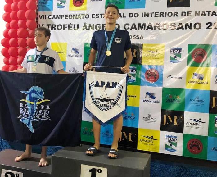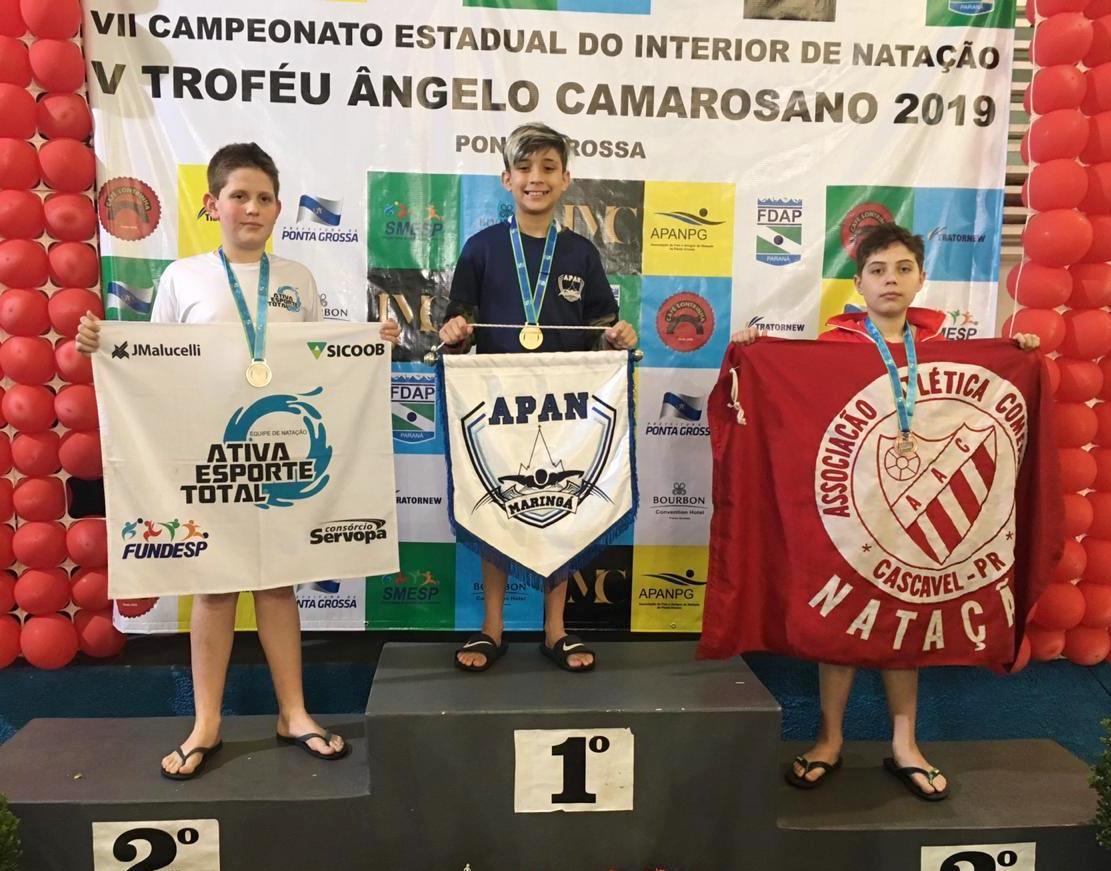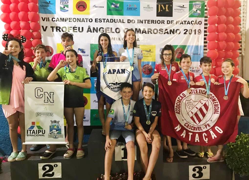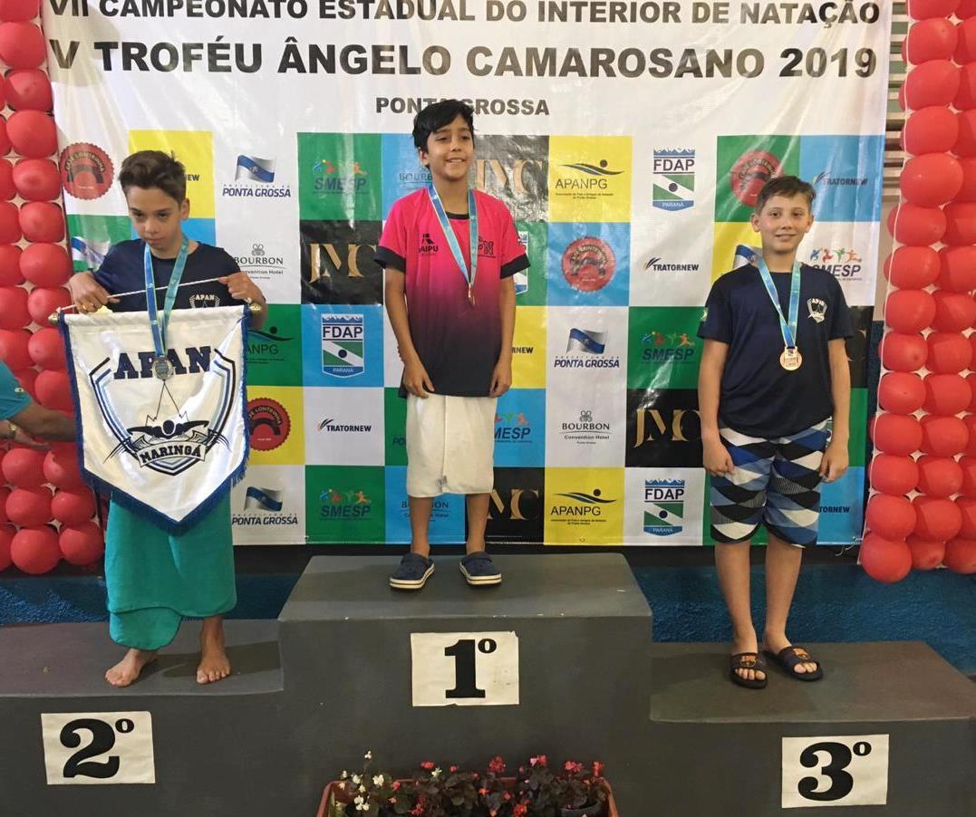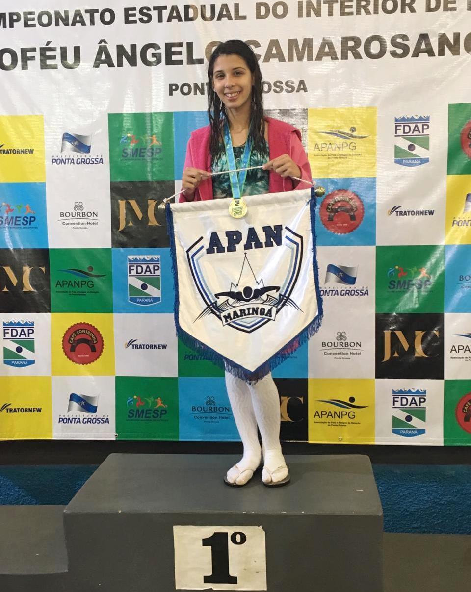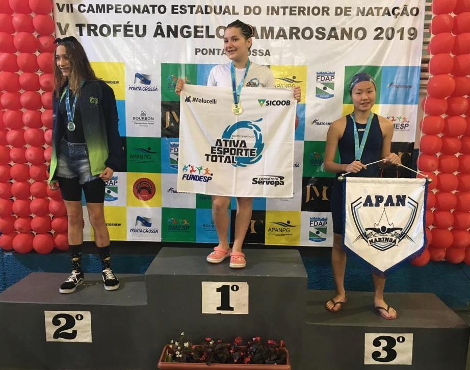 A Associação de Pais e Atletas da Natação (APAN) de Maringá – melhor equipe do interior do Paraná – mostra a sua força no Campeonato Estadual do Interior “Troféu Ângelo Cammarosano”, em disputa até o domingo (1) na piscina municipal Guaíra, em Ponta Grossa. O desempenho dos ´futuros´ craques da natação de Maringá no primeiro dia de provas foi ótimo. Os estudantes-atletas da APAN Maringá visitaram o pódio em 58 ocasiões para receberem 23 medalhas de ouro, 16 medalhas de prata e 19 medalhas de bronze. Conquistas que colocaram Maringá na liderança com 666 pontos. A Ativa Esporte, de Ponta Grossa, vem a seguir com 630 pontos e a Associação Atlética Comercial/Cascavel tem 569 pontos, em terceiro lugar.