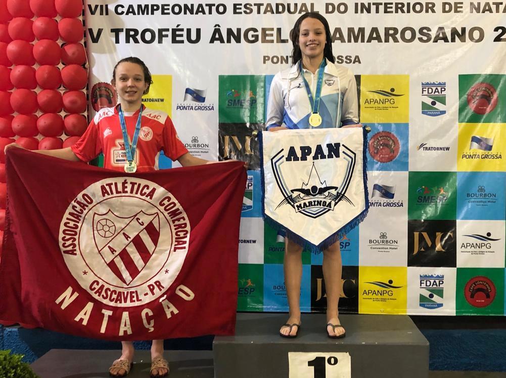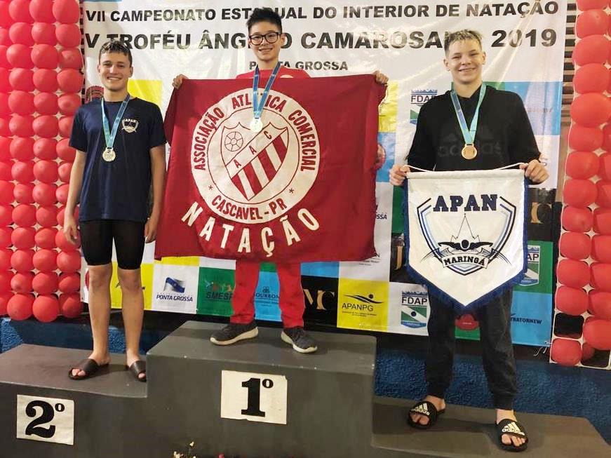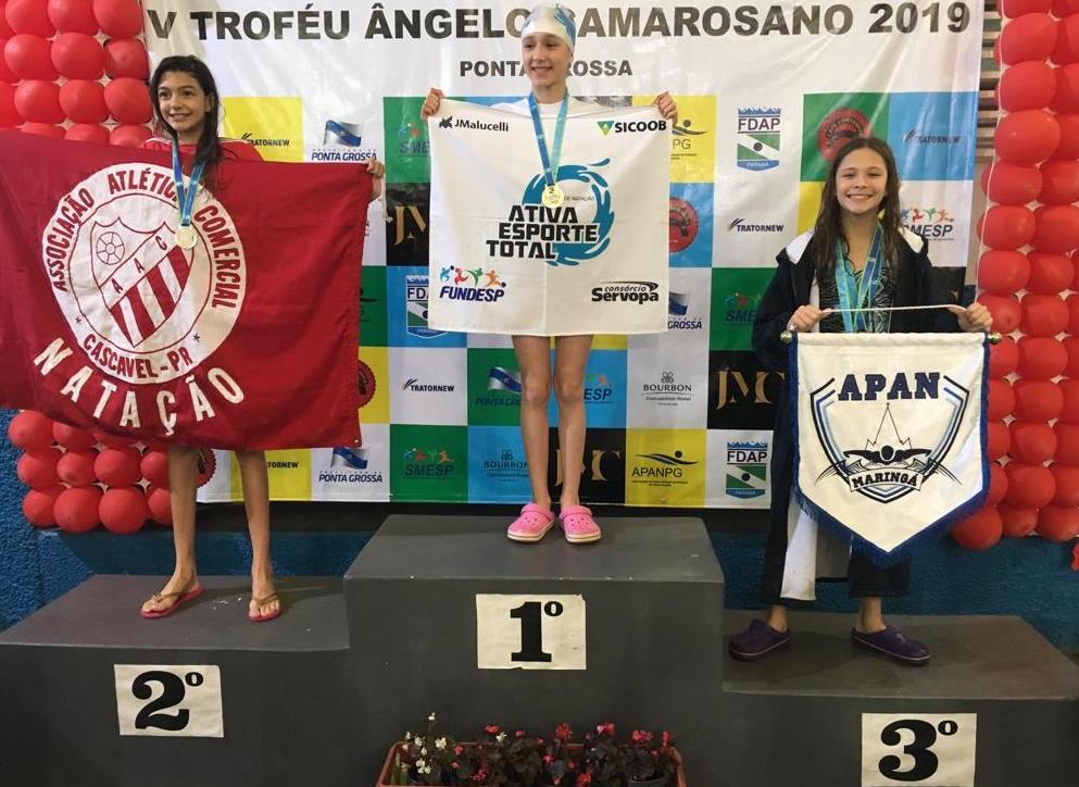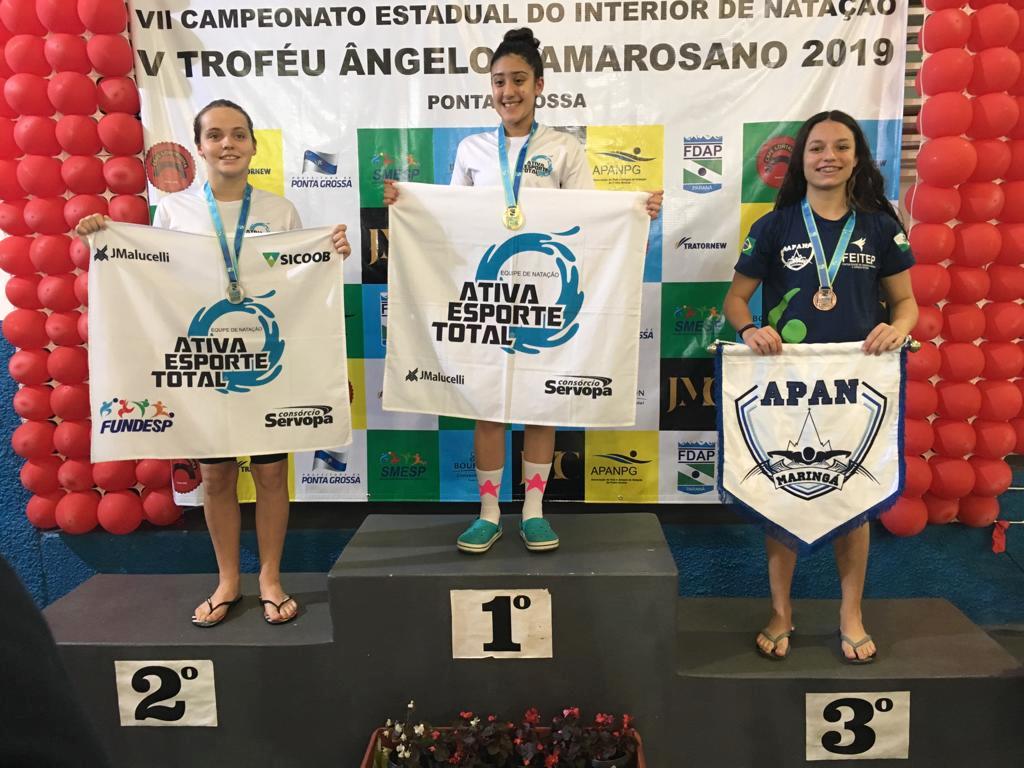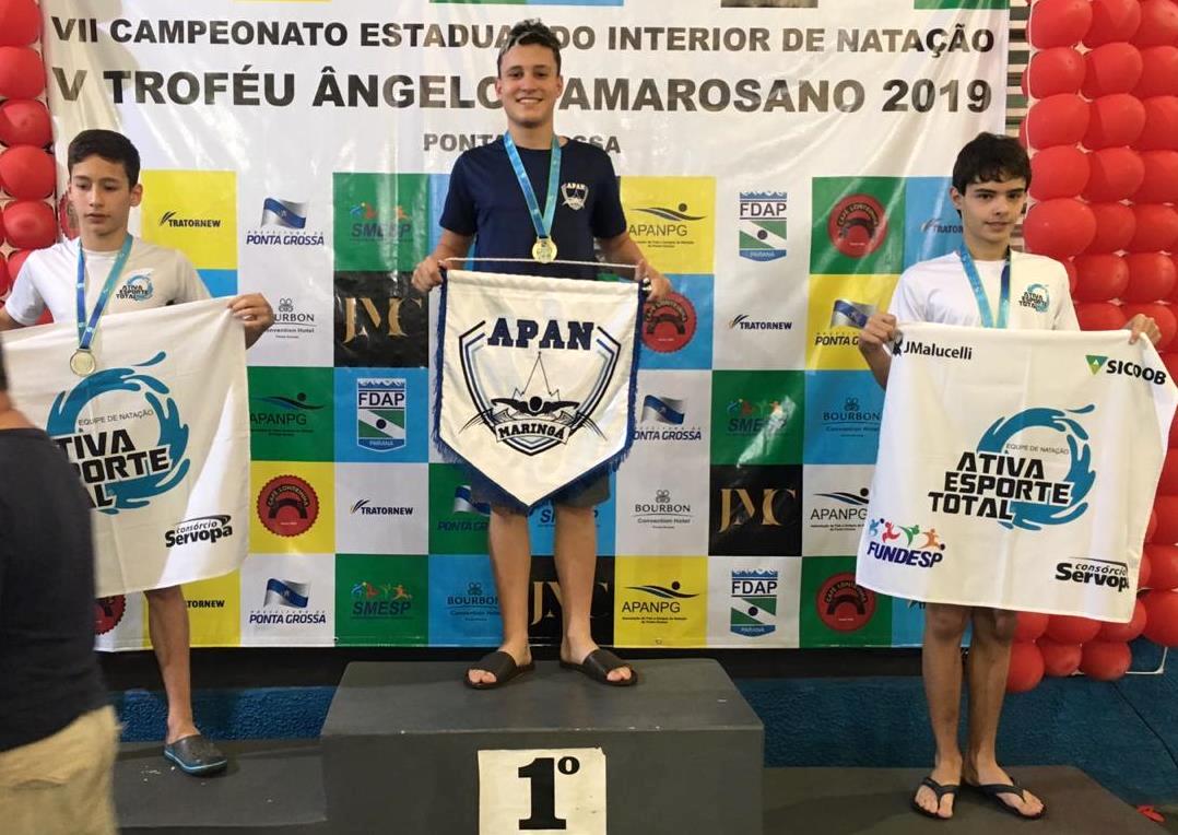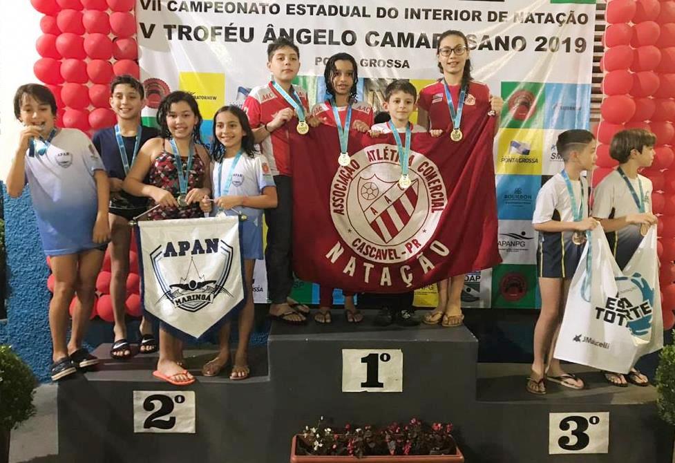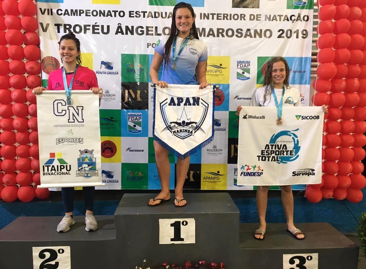 A Associação de Pais e Atletas da Natação (APAN) de Maringá – melhor equipe do interior do Paraná – mostra a sua força no Campeonato Estadual do Interior “Troféu Ângelo Cammarosano”, em disputa até o domingo (1) na piscina municipal Guaíra, em Ponta Grossa. O desempenho dos ´futuros´ craques da natação de Maringá no primeiro dia de provas foi ótimo. Os estudantes-atletas da APAN Maringá visitaram o pódio em 58 ocasiões para receberem 23 medalhas de ouro, 16 medalhas de prata e 19 medalhas de bronze. Conquistas que colocaram Maringá na liderança com 666 pontos. A Ativa Esporte, de Ponta Grossa, vem a seguir com 630 pontos e a Associação Atlética Comercial/Cascavel tem 569 pontos, em terceiro lugar.