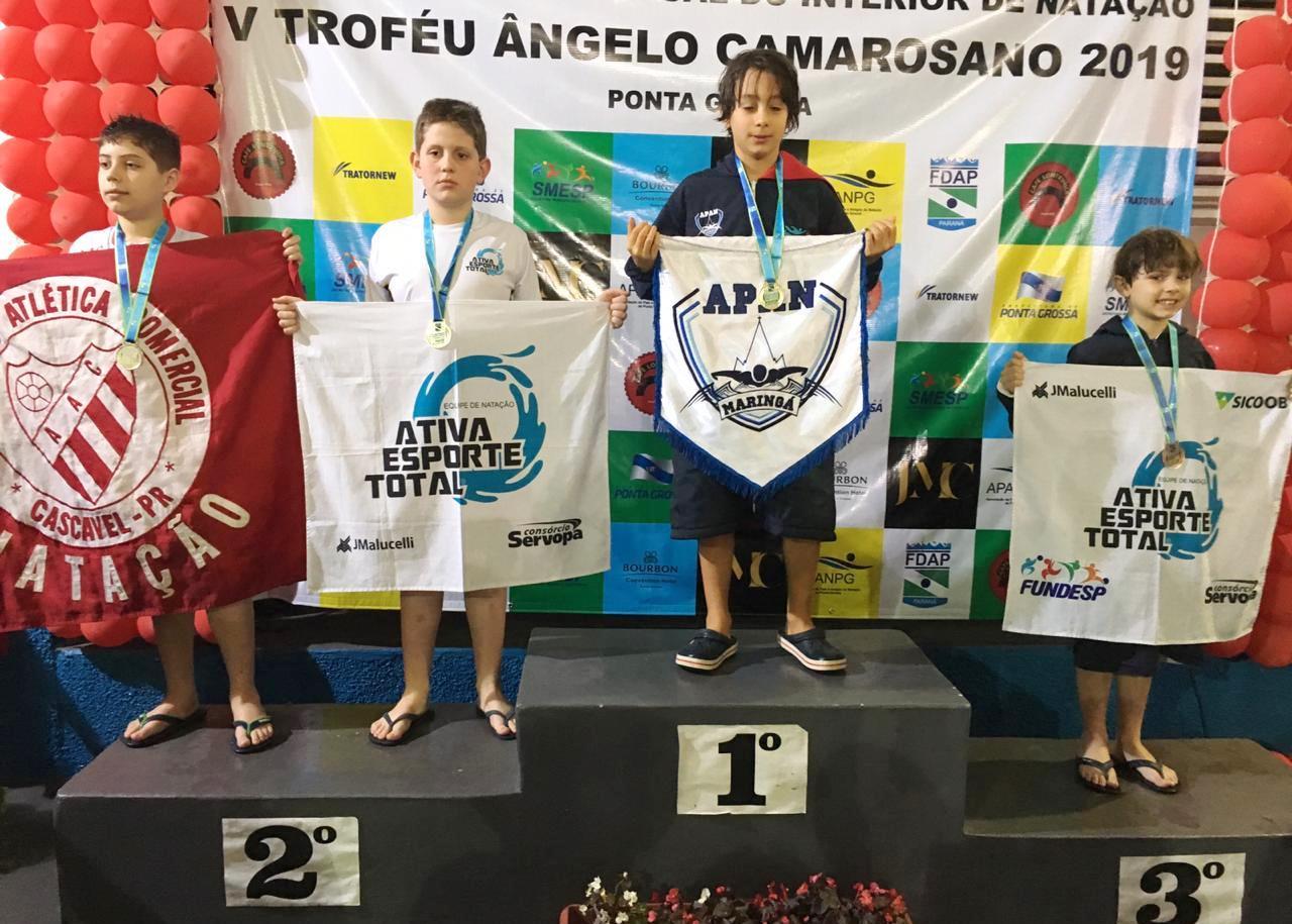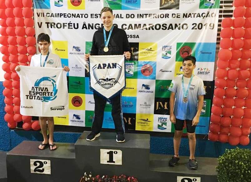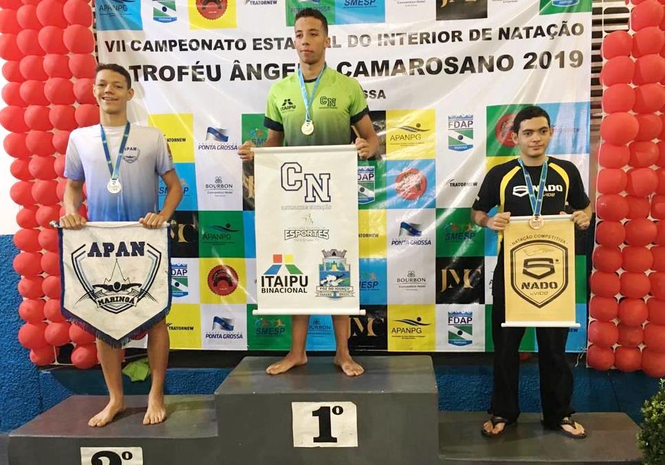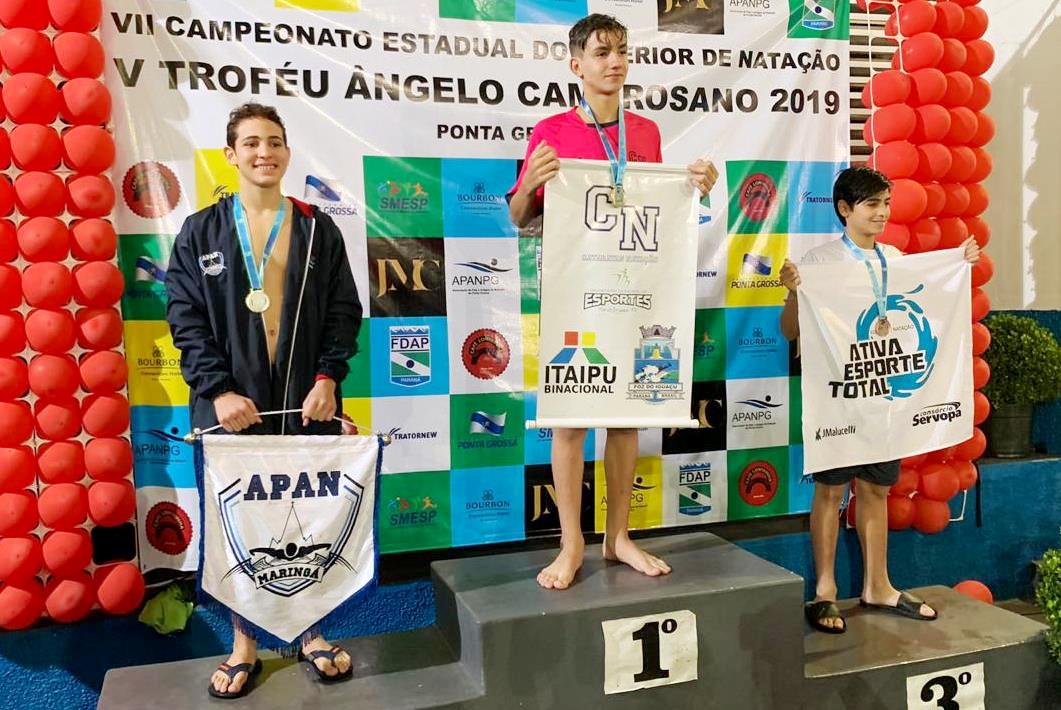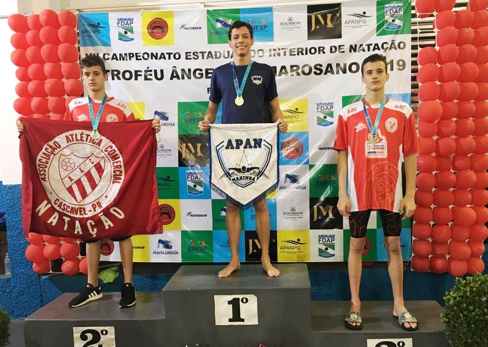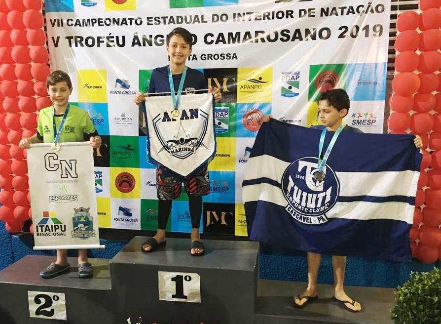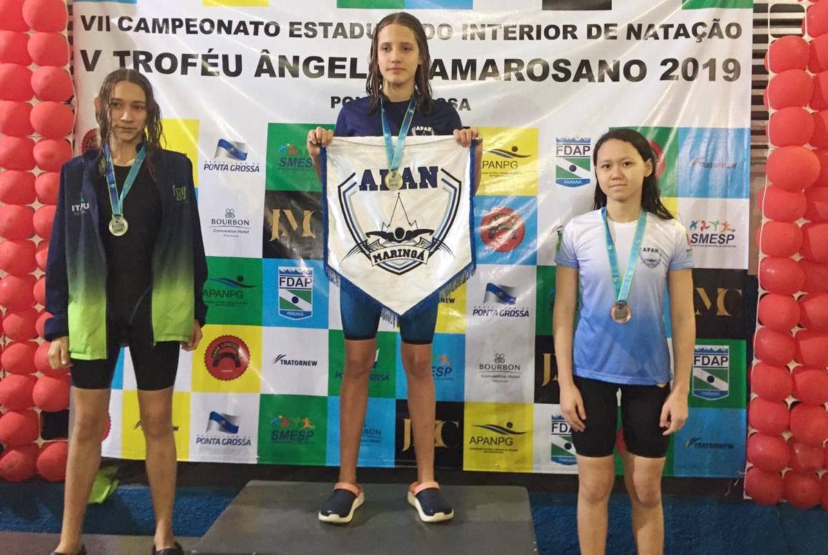 A Associação de Pais e Atletas da Natação (APAN) de Maringá – melhor equipe de natação do interior do Paraná -, ratificou o favoritismo e conquistou, neste domingo (1), o título geral do Campeonato Paranaense de Natação do Interior “Troféu Ângelo Cammarosano”. A competição, iniciada na sexta-feira (30), teve três dias de provas de alto nível na piscina municipal Guaíra, em Ponta Grossa. Os estudantes-nadadores da APAN Maringá foram os que mais visitaram o pódio e brilharam com 71 medalhas de ouro, 39 medalhas de prata e 49 medalhas de bronze. Com 159 medalhas, a equipe maringaense sagrou-se campeã do torneio ao somar 2.009 pontos. A Ativa Esporte, de Ponta Grossa, encerrou na segunda posição, com 1.730,50 pontos, e a Associação Atlética Comercial, de Cascavel, obteve o terceiro lugar, com 1.582 pontos.