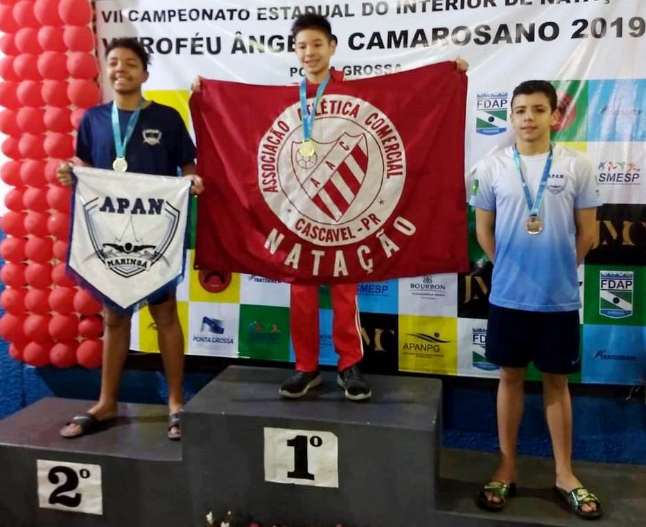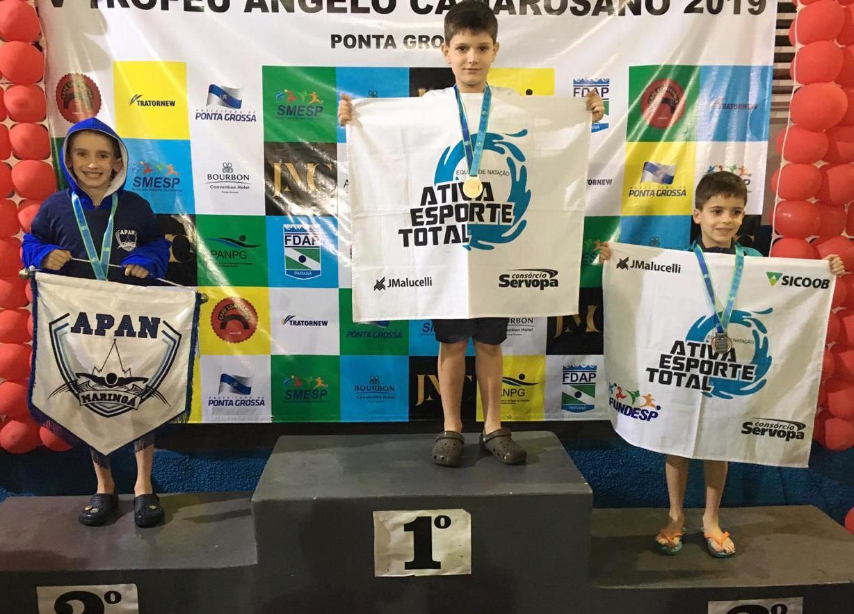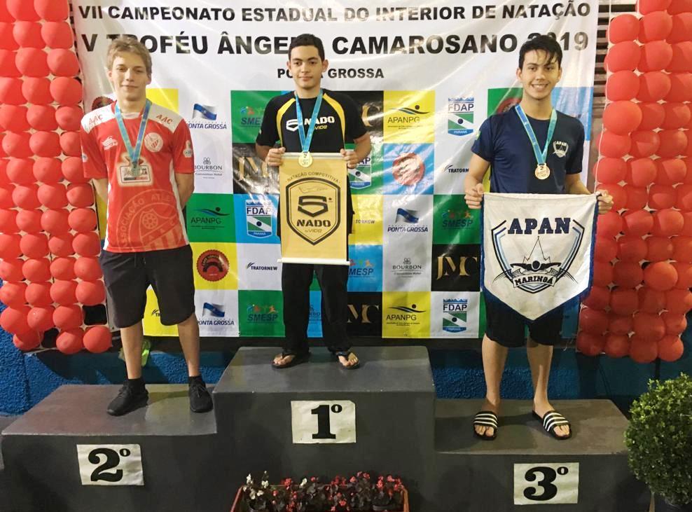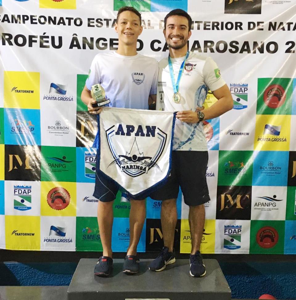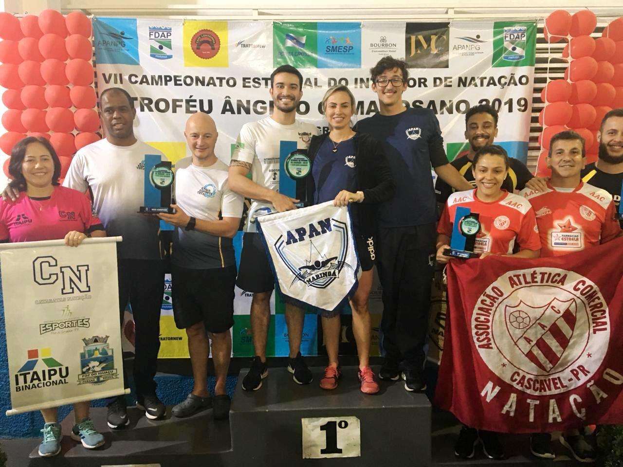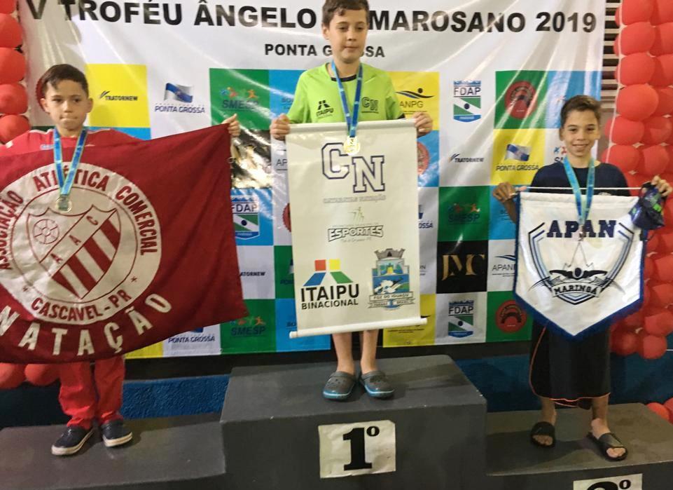 A Associação de Pais e Atletas da Natação (APAN) de Maringá – melhor equipe de natação do interior do Paraná -, ratificou o favoritismo e conquistou, neste domingo (1), o título geral do Campeonato Paranaense de Natação do Interior “Troféu Ângelo Cammarosano”. A competição, iniciada na sexta-feira (30), teve três dias de provas de alto nível na piscina municipal Guaíra, em Ponta Grossa. Os estudantes-nadadores da APAN Maringá foram os que mais visitaram o pódio e brilharam com 71 medalhas de ouro, 39 medalhas de prata e 49 medalhas de bronze. Com 159 medalhas, a equipe maringaense sagrou-se campeã do torneio ao somar 2.009 pontos. A Ativa Esporte, de Ponta Grossa, encerrou na segunda posição, com 1.730,50 pontos, e a Associação Atlética Comercial, de Cascavel, obteve o terceiro lugar, com 1.582 pontos.
