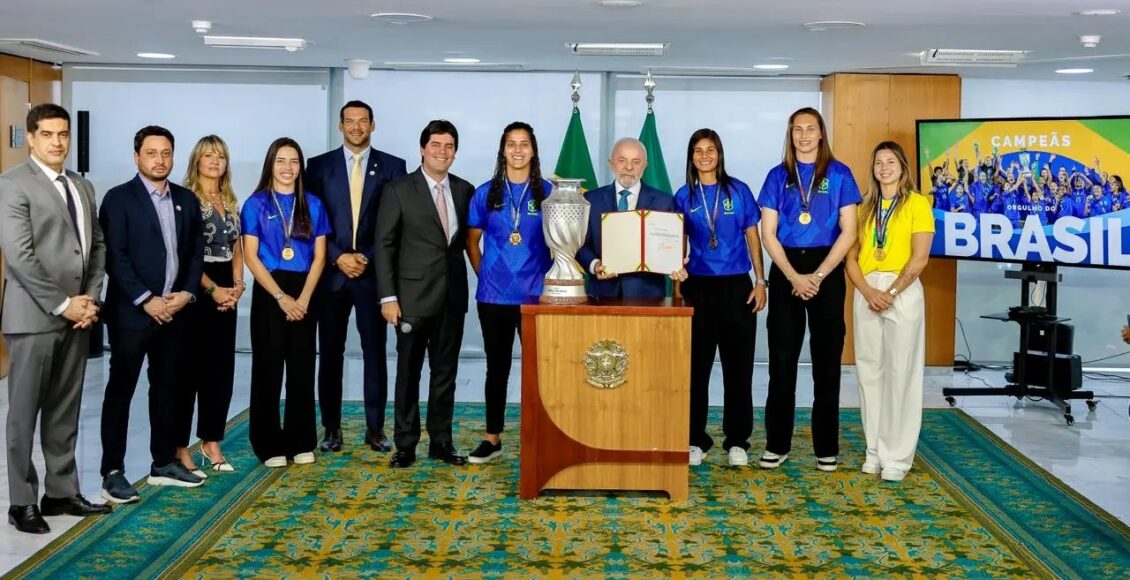 Em evento no Palácio do Planalto, o presidente Lula homenageou na quarta-feira a Seleção Brasileira Feminina pelo título recente da Copa América. A conquista garantiu vaga nos Jogos Olímpicos de Los Angeles 2028 e reforçou o protagonismo do Brasil rumo à Copa do Mundo de 2027, que será disputada pela primeira vez na América do Sul. Ao lado do presidente da CBF, Samir Xaud, Lula recebeu algumas jogadoras, o técnico da equipe, Arthur Elias, e a coordenadora de Seleções Femininas da CBF, Cris Gambaré.