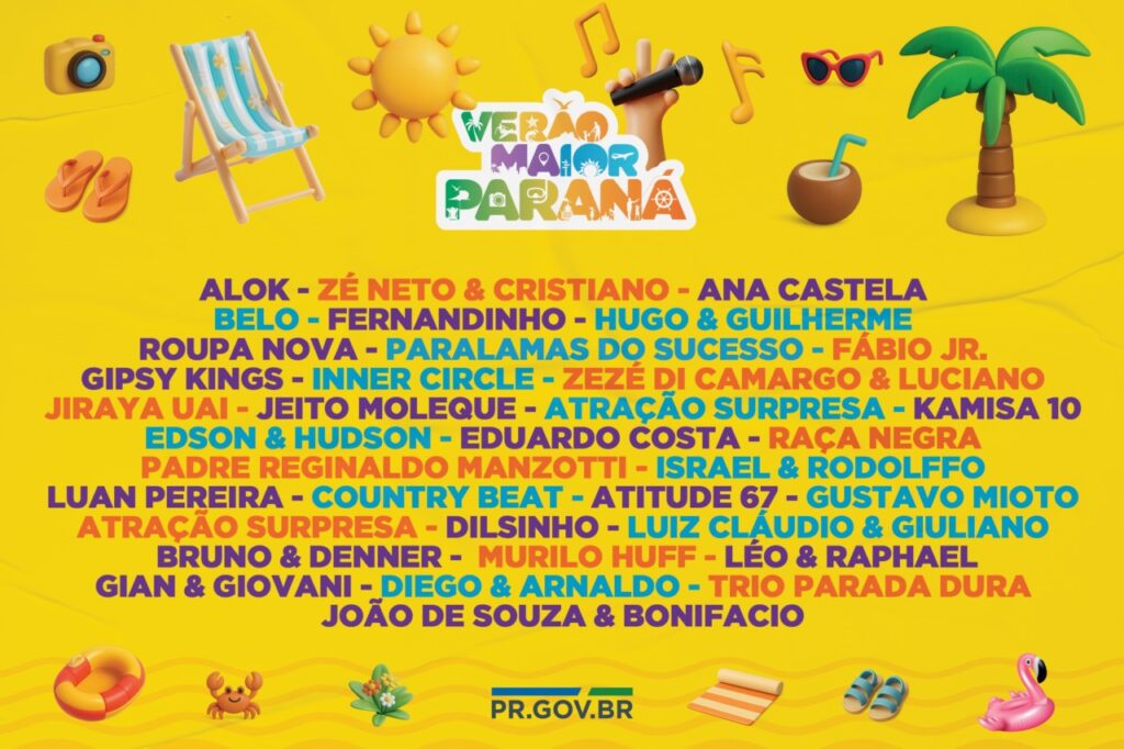 O Governo do Paraná anunciou nesta terça-feira (21) a programação do Verão Maior Paraná 2026. O evento será realizado durante cinco finais de semana, de 9 de janeiro a 8 de fevereiro, nas praias de Matinhos e Pontal do Paraná. A expectativa é de público superior à última edição, que reuniu mais de 1,8 milhão de pessoas.