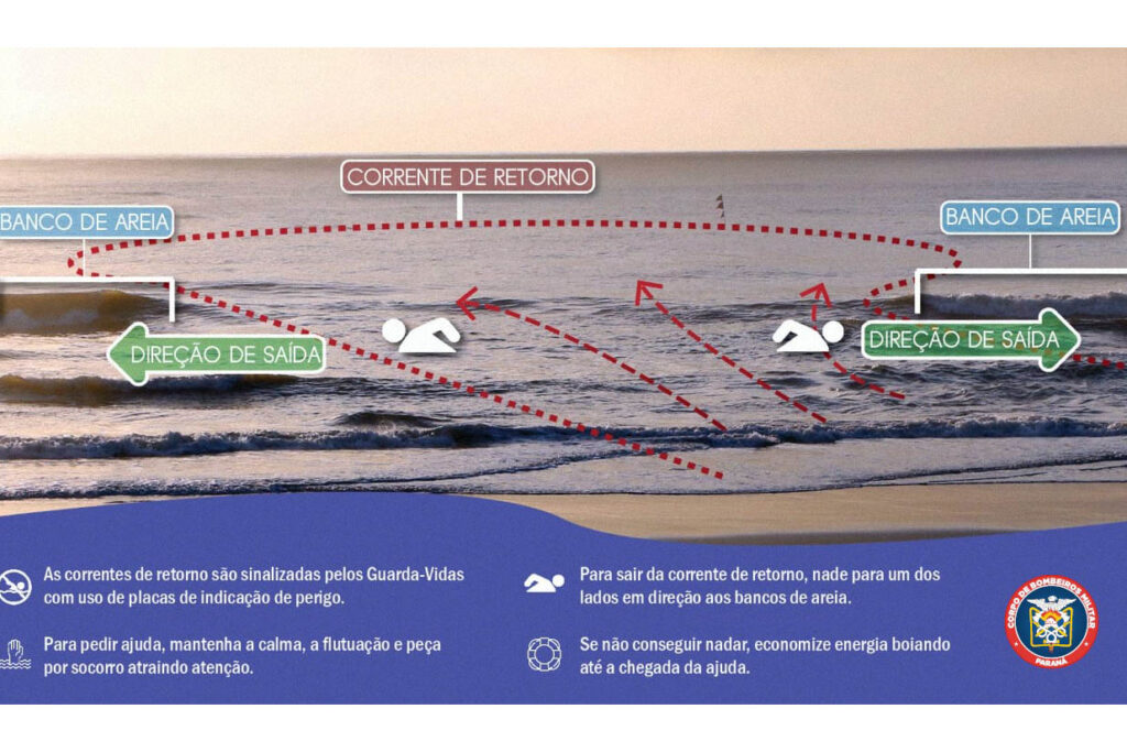 O Corpo de Bombeiros Militar do Paraná (CBMPR) alerta banhistas e turistas sobre os riscos das correntes de retorno no mar, fenômeno associado a grande parte dos casos de afogamento no Litoral do Estado.