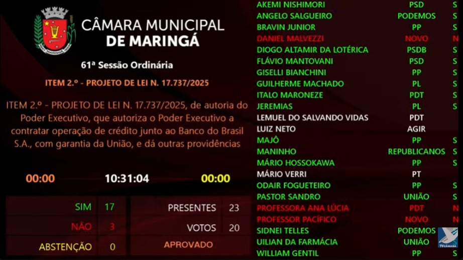 A Câmara Municipal de Maringá aprovou, em segunda discussão nesta quinta-feira (2), o Projeto de Lei Ordinária nº 17.737/2025, de autoria do Poder Executivo, que autoriza a Prefeitura a contratar um empréstimo de R$ 65 milhões com o Banco do Brasil.