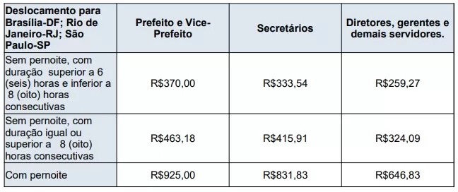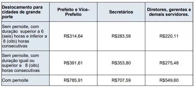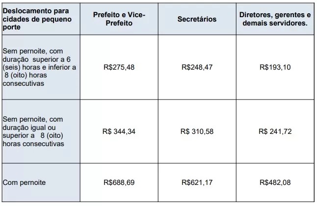 Os valores atuais são regulamentados pela lei Nº 10.624, de 2018. Eles mudam de acordo com o porte da cidade e se há necessidade, ou não, de pernoite (dormir na cidade de destino). Veja os valores que são pagos em cada tipo de diária abaixo: