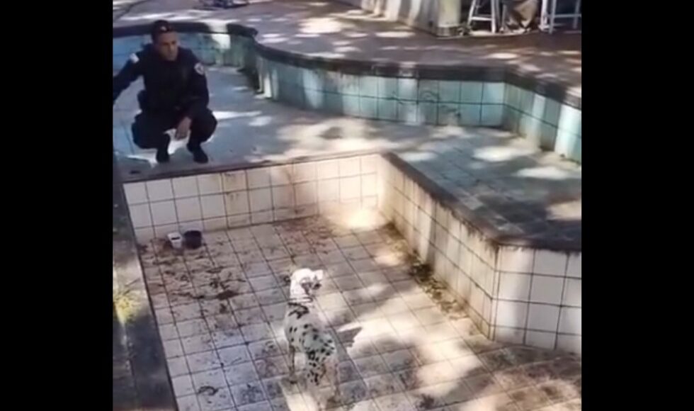 A ocorrência foi registrada após uma denúncia realizada para o telefone de emergência 153, informando que havia um cachorro preso dentro de uma piscina vazia, sem acesso a água ou alimento.