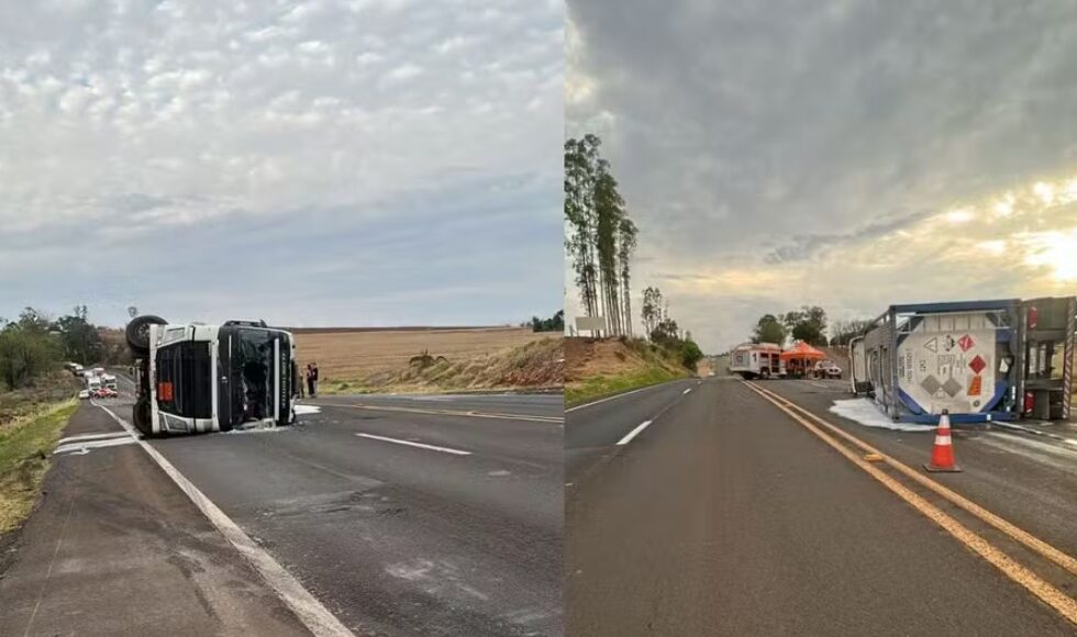 Segundo a Polícia Rodoviária Estadual (PRE), o tombamento aconteceu na quarta-feira (1º), por volta das 15h. O caminhão transportava 16 mil litros de Ácido Propiônico, substância altamente corrosiva. O motorista foi socorrido com ferimentos leves e encaminhado a uma unidade de saúde da região.