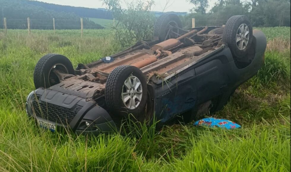 Um Renault Oroch, com placas de Apucarana, saiu da pista e capotou na tarde desse sábado (27), no km 464 da BR-376, em Ponta Grossa.
