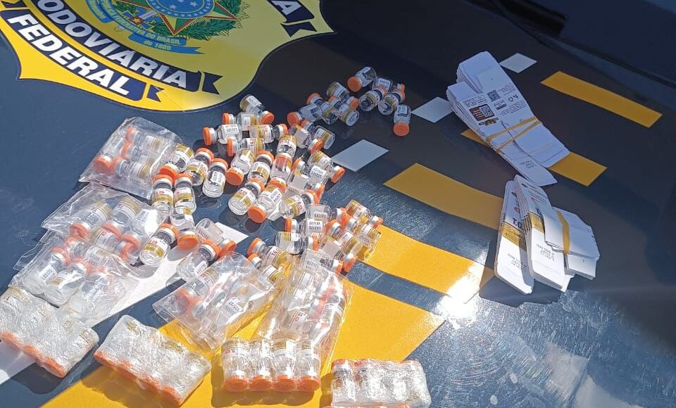 Durante a abordagem a um carro que seguia pela rodovia, os policiais realizaram a fiscalização dos ocupantes e do veículo. Com um dos passageiros, foram encontrados 96 frascos de medicamentos de uso controlado, do tipo Tirzepatida, ocultados nos bolsos da calça, além de embalagens utilizadas para acondicionamento do produto.