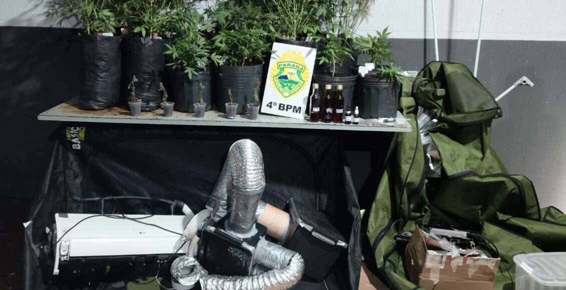 Uma ação da Polícia Militar resultou na apreensão de pés de maconha, estufas e extratos de canabidiol (CBD) em uma sala localizada em um centro comercial na região central de Maringá na tarde desta segunda-feira, 12.