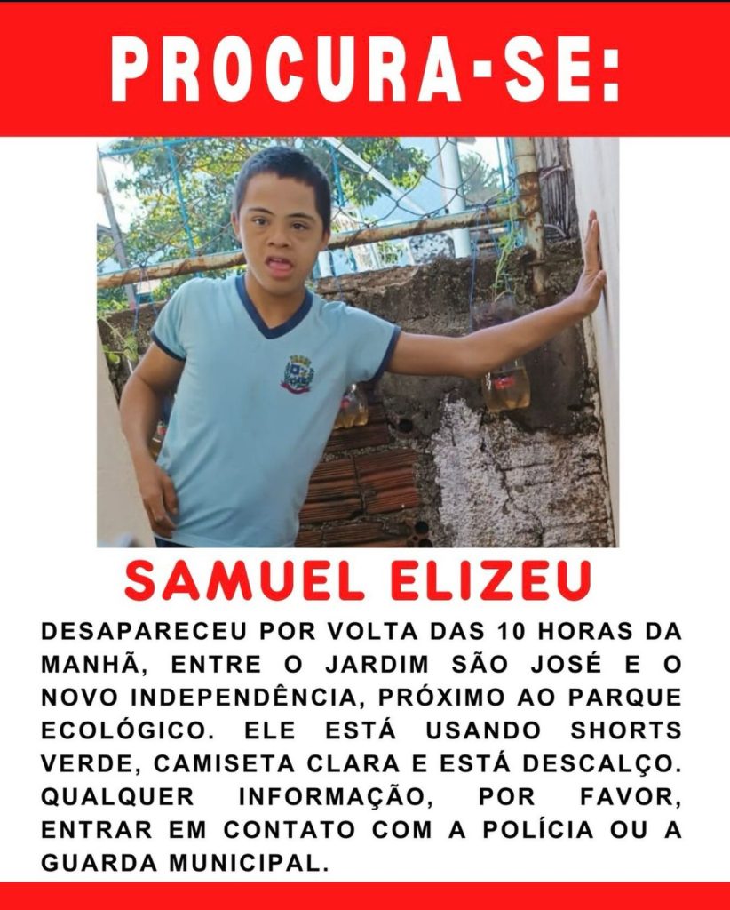 O jovem foi identificado como Samuel Elizeu e, segundo informações repassadas pelos oficiais, ele foi visto pela última vez por volta das 10h30 da manhã.