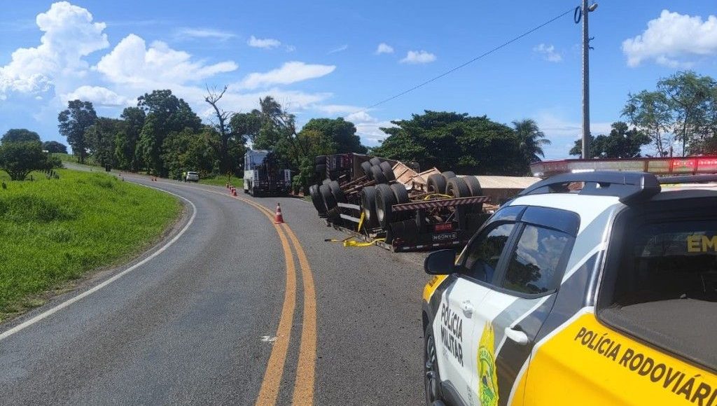 De acordo com a Polícia Rodoviária Estadual (PRE), o tombamento ocorreu pouco antes das 11h, no quilômetro 13 da rodovia. Com o impacto, a carga caiu na margem direita da pista.