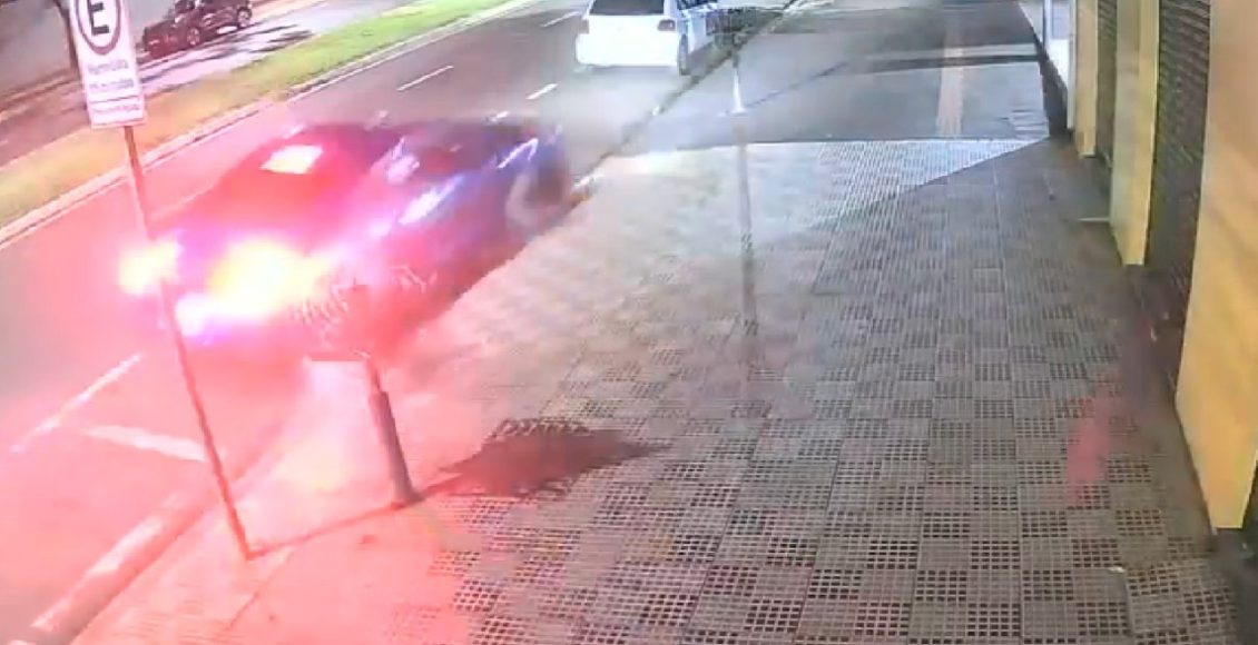 Uma câmera de segurança de um estabelecimento comercial localizado na Avenida Senador Petrônio Portela, em Maringá, flagrou o momento em que um veículo Mustang perde o controle da direção e colide contra um carro estacionado na via. O flagrante foi registrado na madrugada de domingo (22), às 00h05.